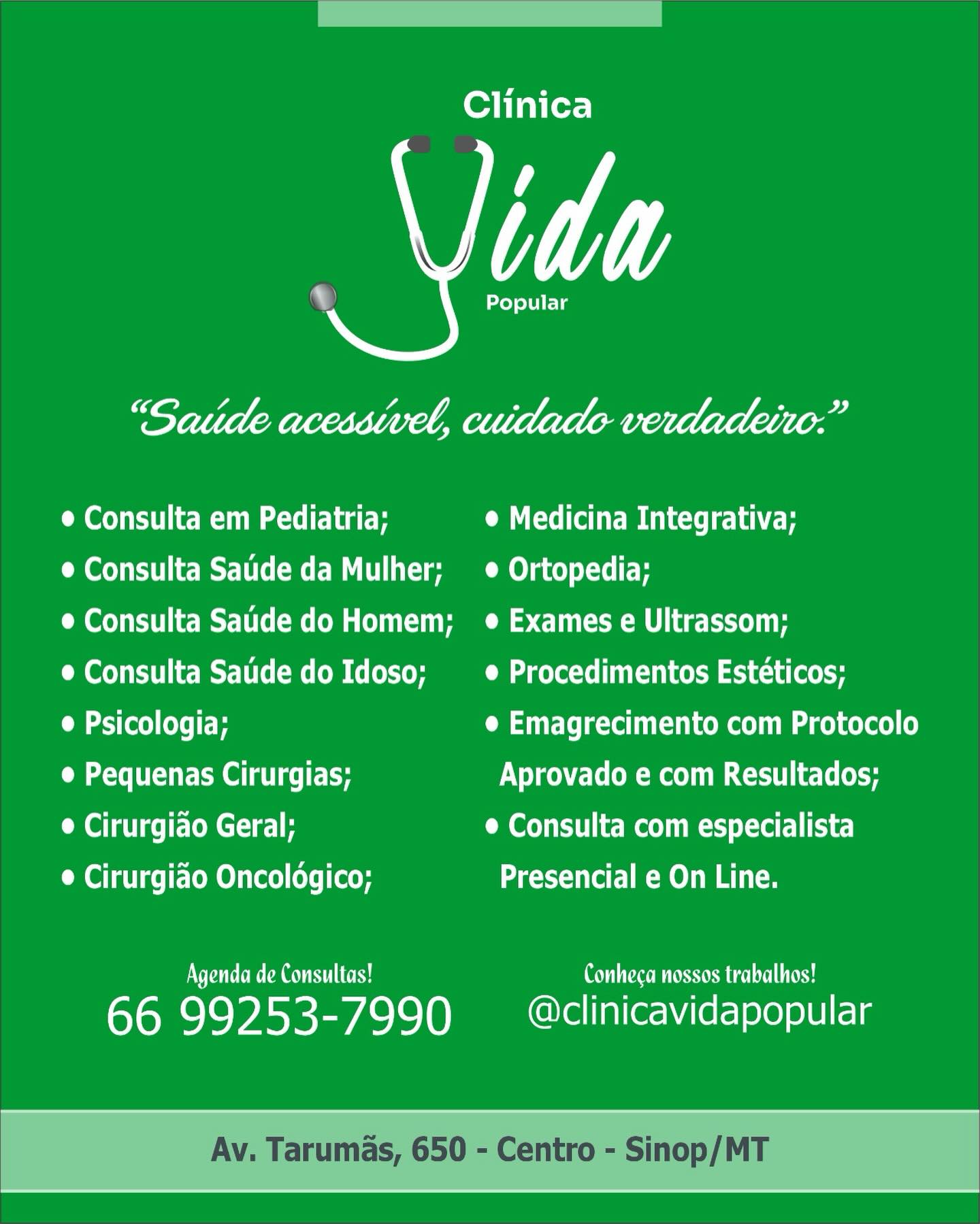 A Clínica Vida Popular está localizada na Avenida dos Tarumãs, nº 650, no Centro de Sinop, e reforça seu compromisso de oferecer atendimento especializado com valores compatíveis com a realidade da maioria das pessoas. E pra melhorar ainda mais, você pode apresentar o CUPOM FERNANDA10 e garantir 10% de desconto em consultas e procedimentos (cirurgias ou protocolos). Agende seu horário no (66) 99253.7990.